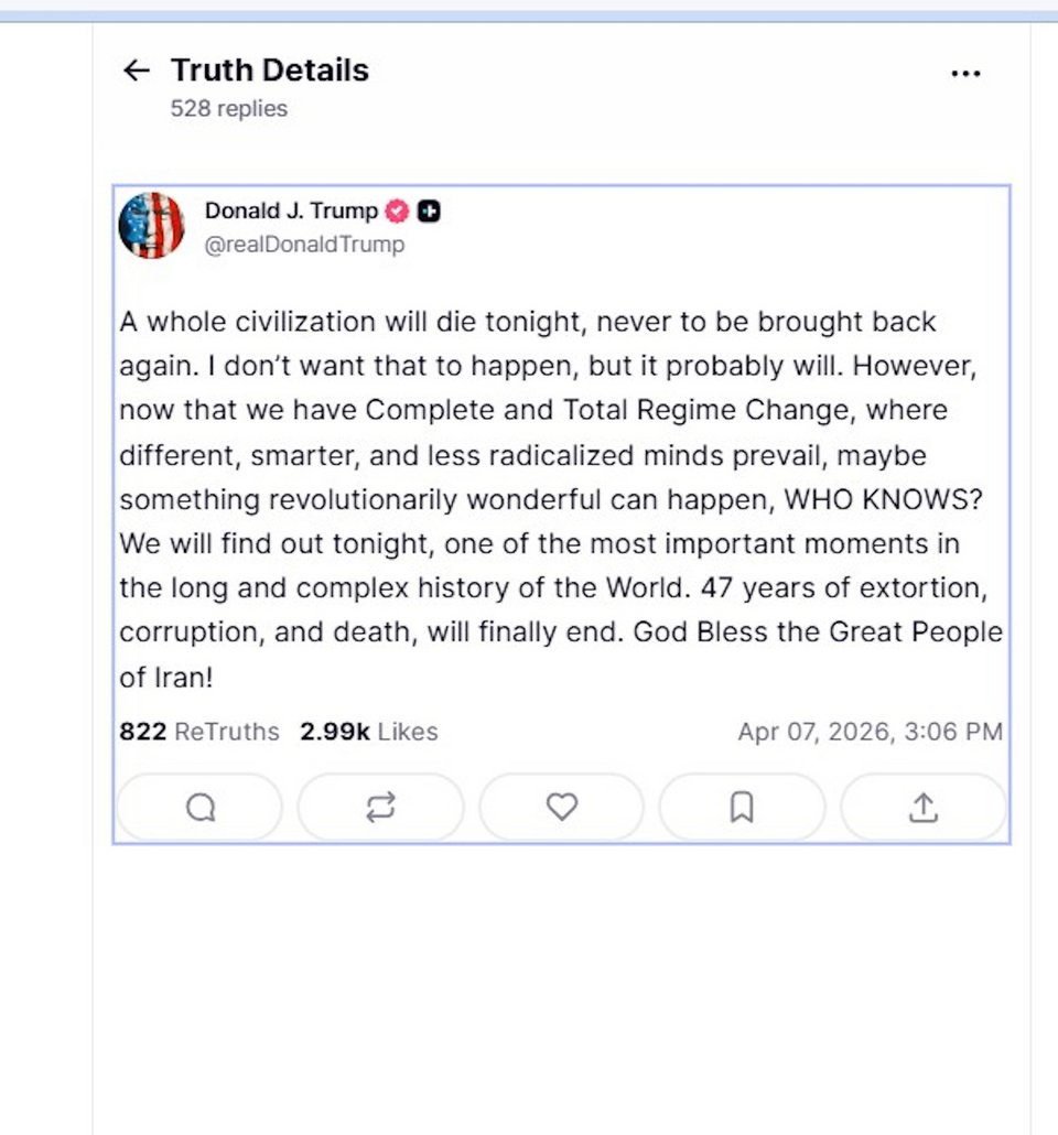 «Ένας ολόκληρος πολιτισμός θα χαθεί απόψε, για να μην ξαναγυρίσει ποτέ», ανέφερε χαρακτηριστικά στην νέα του ανάρτησή στην πλατφόρμα Truth Social.