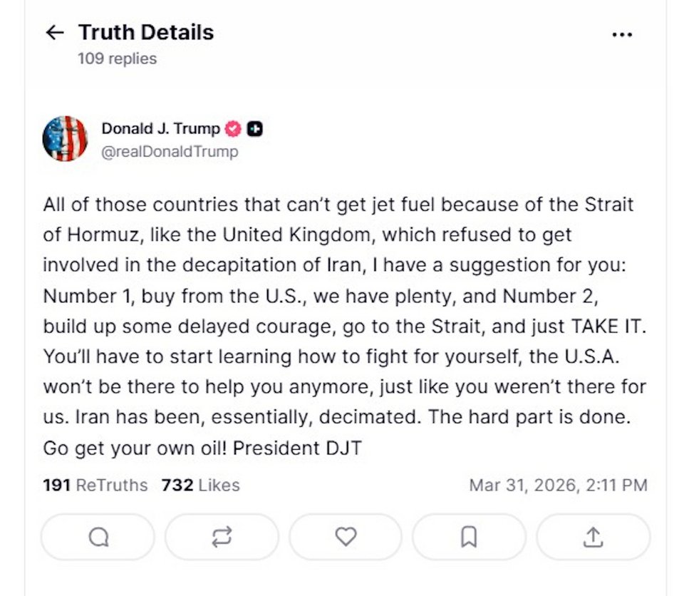 «Όλες αυτές οι χώρες που δεν μπορούν να προμηθευτούν καύσιμα αεροσκαφών εξαιτίας των Στενών του Ορμούζ, όπως το Ηνωμένο Βασίλειο, το οποίο αρνήθηκε να συμμετάσχει στην αποκεφαλισμό του Ιράν, έχω μια πρόταση για εσάς: Πρώτον, αγοράστε από τις ΗΠΑ, έχουμε άφθονα, και δεύτερον, βρείτε το θάρρος που σας λείπει, πηγαίνετε στα Στενά και απλά ΠΑΡΤΕ ΤΑ. Θα πρέπει να αρχίσετε να μαθαίνετε πώς να πολεμάτε μόνοι σας, οι ΗΠΑ δεν θα είναι πια εκεί για να σας βοηθήσουν, ακριβώς όπως εσείς δεν ήσασταν εκεί για εμάς. Το Ιράν έχει, ουσιαστικά, αποδεκατιστεί. Το δύσκολο μέρος έχει τελειώσει. Πηγαίνετε να πάρετε το δικό σας πετρέλαιο! Πρόεδρος DJT».