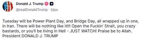 «Η Τρίτη θα είναι ημέρα μονάδων παραγωγής ενέργειας και ημέρα γεφυρών, όλα μαζί, στο Ιράν. Δεν θα έχει υπάρξει τίποτα σαν κι αυτό!!!», έγραψε ο Τραμπ. Άλλωστε αύριο Μ. Δευτέρα λήγει η παράταση στο τελεσίγραφο που έχει δώσει ο Αμερικανός πρόεδρος για το άνοιγμα των στενών του Ορμούζ.