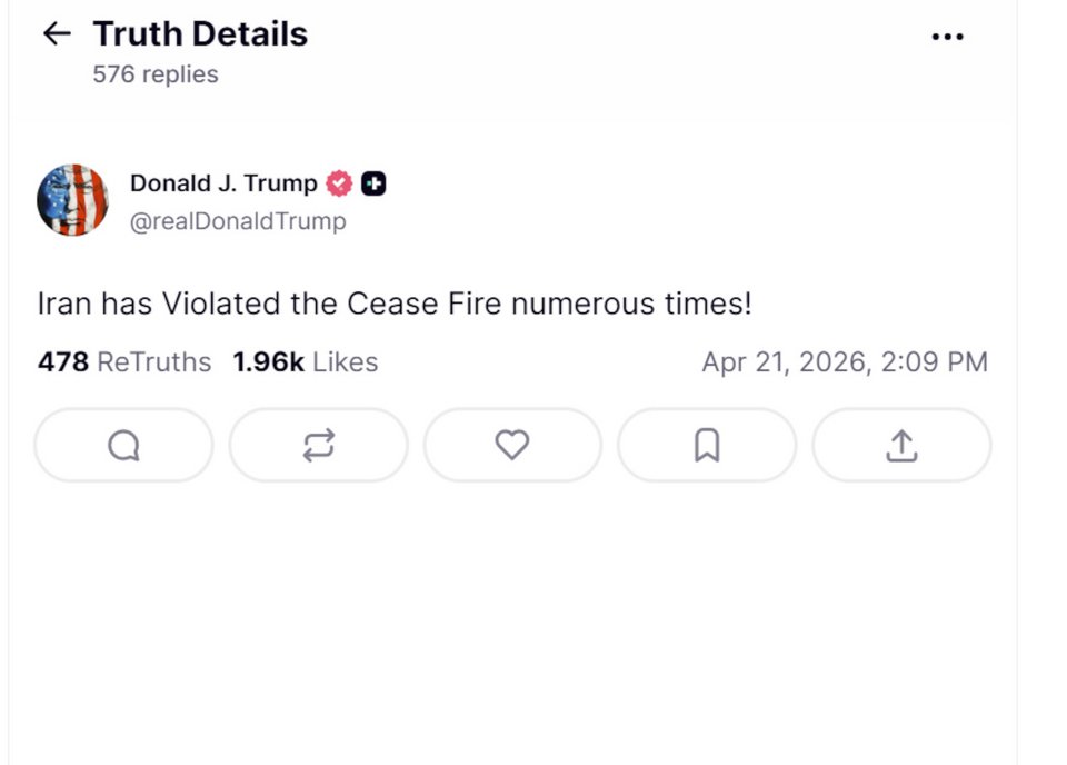 Δεν έδωσε λεπτομέρειες σχετικά με το ποια ήταν τα φερόμενα περιστατικά παραβίασης της εκεχειρίας, αλλά ο Τραμπ ανέφερε σε μια λακωνική του ανάρτηση: