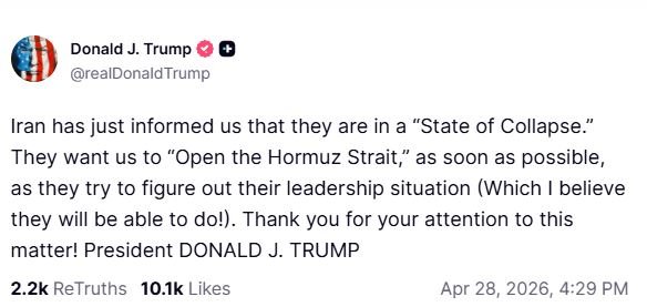 «Το Ιράν μόλις μας ενημέρωσε ότι βρίσκεται σε “Κατάσταση Κατάρρευσης”. Θέλουν να “Ανοίξουμε τα Στενά του Ορμούζ” το συντομότερο δυνατό, καθώς προσπαθούν να ξεκαθαρίσουν την κατάσταση της ηγεσίας τους (κάτι που πιστεύω ότι θα καταφέρουν!). Σας ευχαριστώ για την προσοχή σας σε αυτό το θέμα!» ανέφερε στην ανάρτηση.