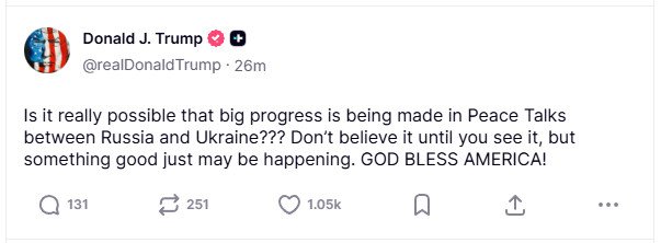 Σε ένα σύντομο μήνυμα στο Truth Social, ο Αμερικανός πρόεδρος έγραψε: «Είναι πραγματικά δυνατόν να σημειώνεται μεγάλη πρόοδος στις Ειρηνευτικές Συνομιλίες μεταξύ Ρωσίας και Ουκρανίας;;; Μην το πιστέψετε μέχρι να το δείτε, αλλά ίσως κάτι καλό να συμβαίνει».