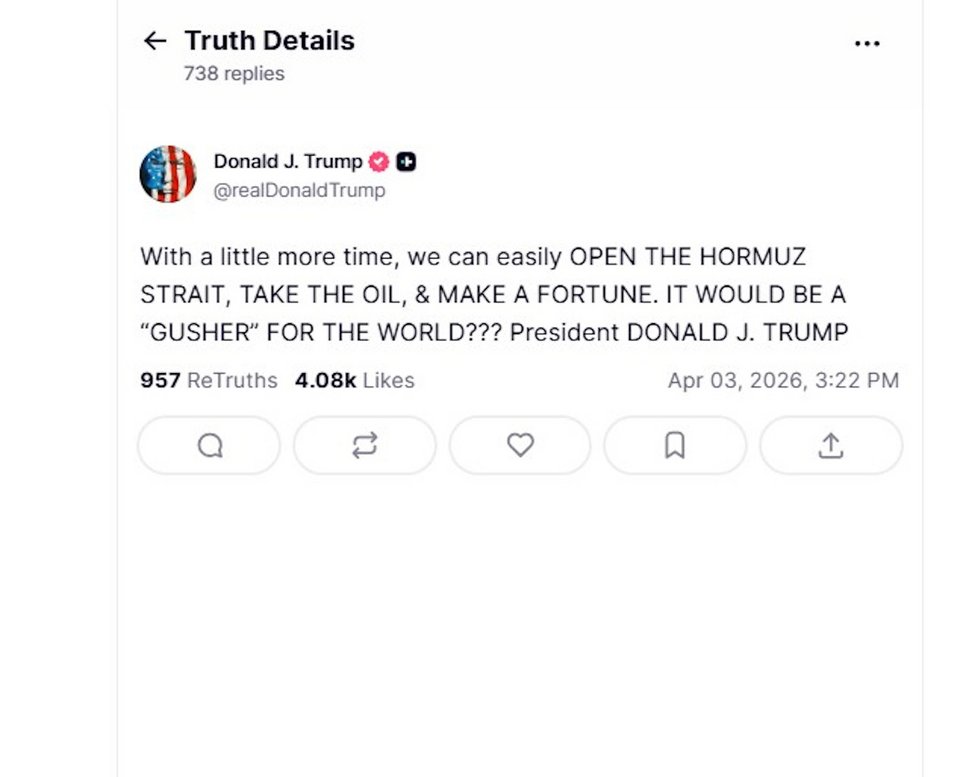 «Με λίγο περισσότερο χρόνο, μπορούμε εύκολα να ΑΝΟΙΞΟΥΜΕ ΤΑ ΣΤΕΝΑ ΤΟΥ ΟΡΜΟΥΖ, ΝΑ ΠΑΡΟΥΜΕ ΤΟ ΠΕΤΡΕΛΑΙΟ ΚΑΙ ΝΑ ΚΕΡΔΙΣΟΥΜΕ ΜΙΑ ΠΕΡΙΟΥΣΙΑ. ΘΑ ΗΤΑΝ ΜΙΑ ''ΠΛΟΥΣΙΑ ΠΗΓΗ'' ΓΙΑ ΤΟΝ ΚΟΣΜΟ??? Πρόεδρος ΝΤΟΝΑΛΝΤ ΤΡΑΜΠ», έγραψε στην ανάρτησή του.