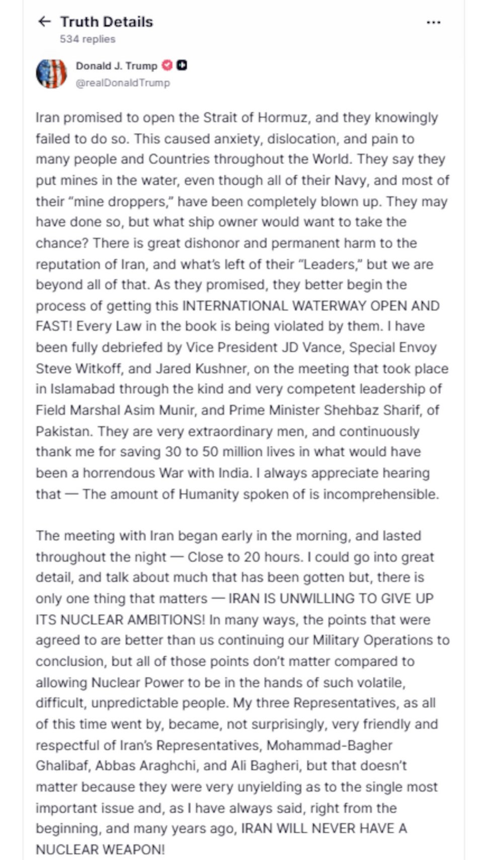 Ο Τραμπ έκανε τα σχόλια αυτά σε ανάρτηση στο Truth Social ώρες αφότου οι ειρηνευτικές συνομιλίες ΗΠΑ-Ιράν τελείωσαν χωρίς συμφωνία. Ο Τραμπ είπε πως η συνάντηση «πήγε καλά, τα περισσότερα σημεία συμφωνήθηκαν» αλλά πρόσθεσε πως οι δύο πλευρές δεν κατέληξαν σε συμφωνία για το πυρηνικό πρόγραμμα του Ιράν.