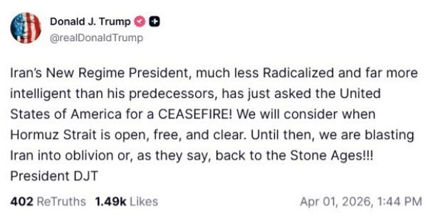 Συγκεκριμένα, σε ανάρτησή του στο Truth Social ο Αμερικανός πρόεδρος έγραψε: «Ο πρόεδρος του νέου καθεστώτος του Ιράν, πολύ λιγότερο ριζοσπαστικός και πολύ πιο έξυπνος από τους προκατόχους του, μόλις ζήτησε από τις Ηνωμένες Πολιτείες της Αμερικής ΕΚΕΧΕΙΡΙΑ! Θα εξετάσουμε το αίτημα όταν τα Στενά του Ορμούζ είναι ανοιχτά, ελεύθερα και ασφαλή. Μέχρι τότε, θα καταστρέψουμε το Ιράν ή, όπως λένε, θα το στείλουμε πίσω στη Λίθινη Εποχή!».