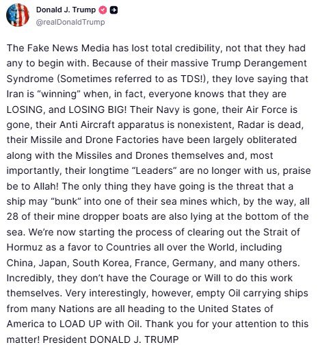 «Τα ΜΜΕ των ψευδών ειδήσεων έχουν χάσει πλήρως την αξιοπιστία τους, όχι ότι είχαν καμία εξ αρχής. Λόγω του έντονου «Συνδρόμου Εμμονής με τον Τραμπ» (που μερικές φορές αναφέρεται ως TDS!), τους αρέσει να λένε ότι το Ιράν «κερδίζει», ενώ στην πραγματικότητα όλοι γνωρίζουν ότι ΧΑΝΕΙ, και ΧΑΝΕΙ ΣΕ ΜΕΓΑΛΟ ΒΑΘΜΟ! Ο Ναυτικός τους Στόλος έχει εξαφανιστεί, η Πολεμική τους Αεροπορία έχει εξαφανιστεί, ο Αντιαεροπορικός τους εξοπλισμός είναι ανύπαρκτος, τα Ραντάρ τους είναι νεκρά, τα Εργοστάσια Πυραύλων και Δρόνων τους έχουν καταστραφεί σε μεγάλο βαθμό μαζί με τους ίδιους τους Πυραύλους και τα Δρόνια και, το πιο σημαντικό, οι μακροχρόνιοι 'Ηγέτες' τους δεν είναι πλέον μαζί μας, δόξα στον Αλλάχ!»