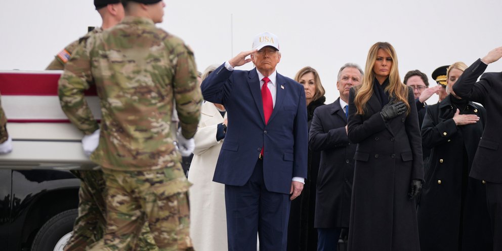 Στην επιστροφή των 6 σορών Αμερικανών στρατιωτών που σκοτώθηκαν όταν ιρανικό drone έπληξε αμερικανική εγκατάσταση στο Κουβέιτ παραβρέθηκε ο Ντόναλντ Τραμπ.