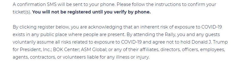 «Πατώντας το κουμπί της εγγραφής, αποδέχεστε ότι υπάρχει κίνδυνος έκθεσης στον κορωνοϊό σε οποιονδήποτε δημόσιο χώρο όπου παρίστανται άλλοι άνθρωποι και συμμετέχοντας σε αυτή τη συγκέντρωση, εσείς και οι άλλοι προσκεκλημένοι αναλαμβάνετε την πλήρη ευθύνη για όλους τους κινδύνους», αναφέρεται στη σελίδα για τη συγκέντρωση του Τραμπ στην Οκλαχόμα την Παρασκευή 19η Ιουνίου. Ζητείται επίσης να μη γίνει επίρριψη της ευθύνης για ενδεχόμενη μόλυνση σε στέλεχος ή εργαζόμενο της εκστρατείας του δισεκατομμυριούχου. Δεν γίνεται καμία αναφορά στη χρήση προστατευτικής μάσκας.