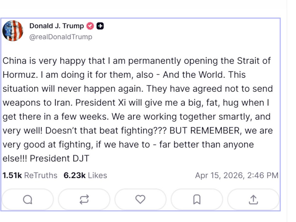 «Η Κίνα είναι πολύ ευχαριστημένη που ανοίγω μόνιμα τα Στενά του Ορμούζ. Το κάνω και για χάρη τους - αλλά και για χάρη του κόσμου. Αυτή η κατάσταση δεν θα ξανασυμβεί ποτέ. Έχουν συμφωνήσει να μη στέλνουν όπλα στο Ιράν. Ο πρόεδρος Σι θα μου δώσει μια μεγάλη, ζεστή αγκαλιά όταν φτάσω εκεί σε λίγες εβδομάδες. Συνεργαζόμαστε έξυπνα και πολύ καλά! Δεν είναι καλύτερο από το να πολεμάμε; ΑΛΛΑ ΘΥΜΗΘΕΙΤΕ, είμαστε πολύ καλοί στον πόλεμο, αν χρειαστεί - πολύ καλύτεροι από οποιονδήποτε άλλο!!! Πρόεδρος DJT».