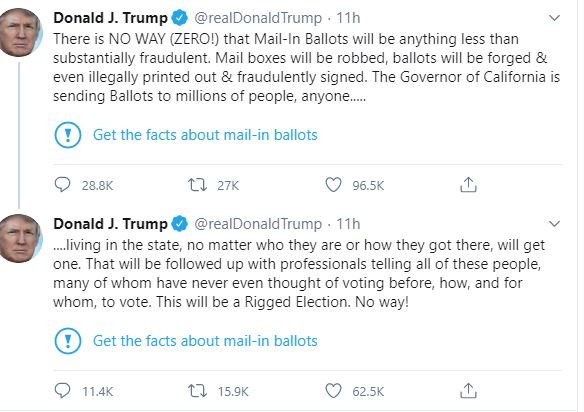 Ο οργανισμός τοποθέτησε μια ειδοποίηση που καλεί τους χρήστες να «ενημερωθούν για τα γεγονότα» σε μια ανάρτηση του Ρεπουμπλικάνου προέδρου Ντόναλντ Τραμπ σχετικά με τις επιστολικές ψήφους, στην οποία ο ένοικος του Λευκού Οίκου διατείνεται πως οι ψήφοι αυτές είναι «ουσιαστικά χαλκευμένες» και θα έχουν αποτέλεσμα «εκλογική νοθεία».