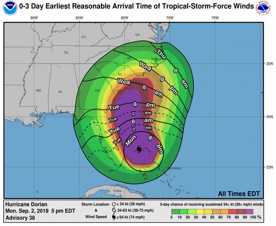 Την ίδια ώρα, στις ΗΠΑ ετοιμάζονται να ζήσουν το πέρασμα του Dorian. Ηδη έχουν εκκενωθεί αρκετές περιοχές στη νότια Φλόριντα, την Τζόρτζια, αλλά και την πολιτεία της Νότιας Καρολίνας. Υπολογίζεται ότι περίπου 1,5 εκατομμύριο άνθρωποι θα εκκενώσουν τις κατοικίες τους, προκειμένου να προφυλαχθούν από το πέρασμα του τυφώνα. Οι μεγαλύτερη ισχύς του θα είναι στις ακτές των τριών Πολιτειών, ενώ στην ηπειρωτική χώρα, αναμένεται οι άνεμοι να ξεπεράσουν τα 100χλμ ανά ώρα.
