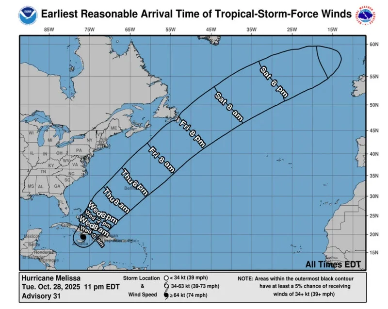 Σύμφωνα με τις προβλέψεις, αργότερα την Τετάρτη ο «Μελίσα» θα πλήξει τα νοτιοανατολικά ή κεντρικά στις Μπαχάμες, ενώ θα φέρει τροπικές καταιγίδες στην Αϊτή. Μέχρι την Πέμπτη αναμένεται να πλησιάσει τη Βερμούδα.