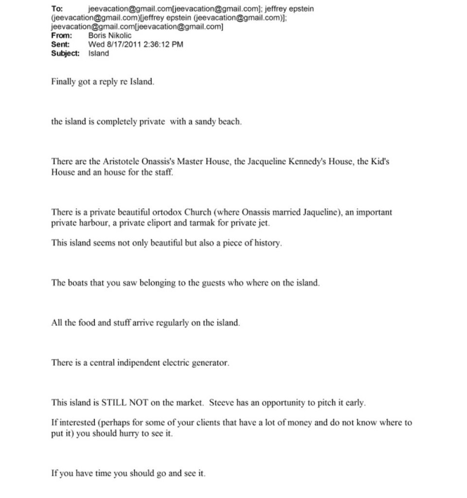 Στις 17 Αυγούστου 2011, ο Νίκολιτς ενημέρωσε τον Έπσταϊν ότι το νησί είναι εξ ολοκλήρου ιδιωτικό, διαθέτει κατοικίες, ελικοδρόμιο και ισχυρό ιστορικό φορτίο, συνδεδεμένο με τον Αριστοτέλη Ωνάση και την Τζάκι Κένεντι.