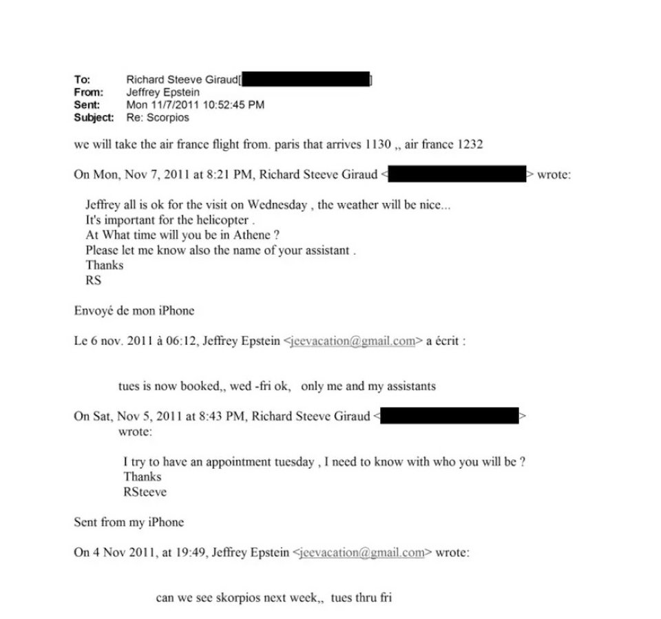 Στις 5 Αυγούστου 2011, ο Ζιρό έστειλε στον Νίκολιτς πληροφορίες για διάφορα νησιά, με τον τελευταίο να ενημερώνει την επόμενη ημέρα τον Έπσταϊν και να ξεχωρίζει τον Σκορπιό, τον οποίο χαρακτήρισε «ένα από τα πιο ιδιωτικά νησιά στην Ελλάδα».