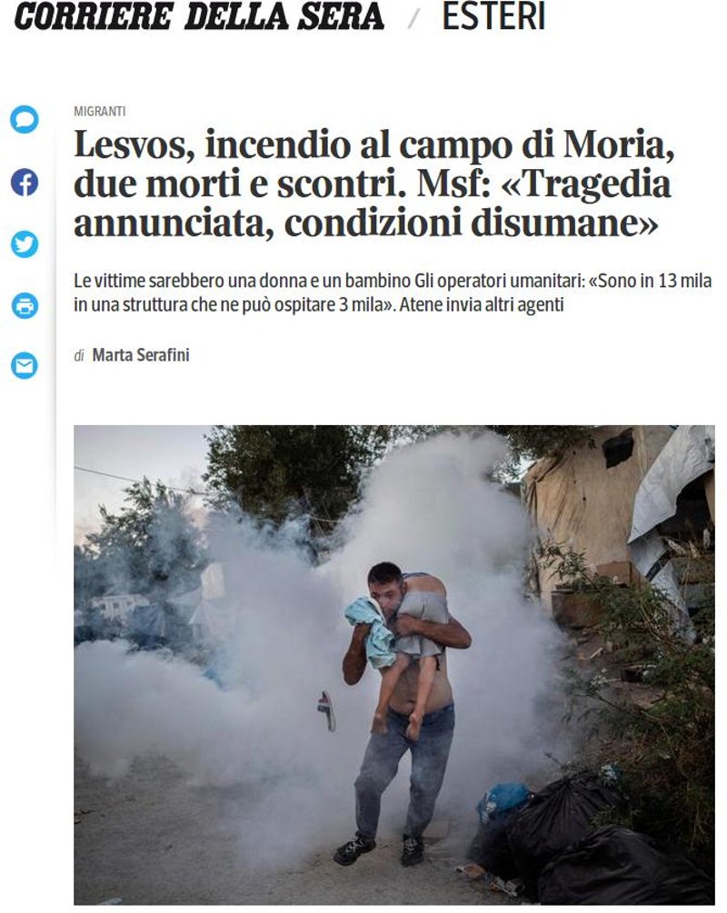 Για «προαναγγελθείσα τραγωδία» και «απάνθρωπες συνθήκες» στη Μόρια κάνει λόγο η ιταλική Corriere della Sera. «Ο καταυλισμός της Μόρια στη Λέσβο βρίσκεται εδώ και χρόνια στο επίκεντρο μεγάλης πολεμικής λόγω του υπερπληθυσμού των προσφύγων... Το hotspot της Μόρια και ο ανεπίσημος καταυλισμός του Ελαιώνα που γεννήθηκε έξω από τα όρια του επίσημου είναι εδώ και χρόνια σύμβολο των δυσκολιών που αντιμετωπίζει η Ελλάδα στη συγκράτηση του προσφυγικού κύματος, που κατέγραψε αύξηση των αφίξεων τους τελευταίους μήνες».