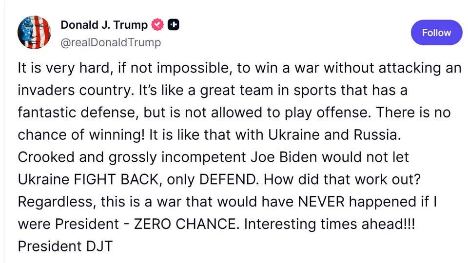 Και ο Ντόναλντ Τραμπ εμφανίζεται πλέον πιο ανοικτός στην ιδέα να περάσει η Ουκρανία στην αντεπίθεση: «Είναι πολύ δύσκολο, αν όχι αδύνατο, να κερδίσεις έναν πόλεμο χωρίς να επιτεθείς σε μια χώρα εισβολέα. Είναι σαν μια σπουδαία ομάδα στον αθλητισμό που έχει μια φανταστική άμυνα, αλλά δεν της επιτρέπεται να παίζει επιθετικά».