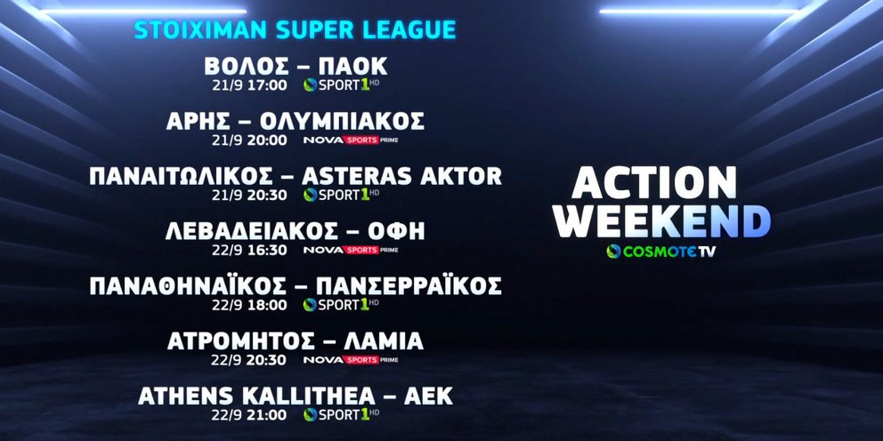 Οι συνδρομητές της COSMOTE TV, μέσω των καναλιών Novasports, θα έχουν τη δυνατότητα να παρακολουθήσουν το ντέρμπι της 5ης αγωνιστικής της StoiximanSuperLeague ανάμεσα σε Άρη και Ολυμπιακό (21/9, 20.00), καθώς και τα ματς Λεβαδειακός-ΟΦΗ (22/9, 16.30) και Ατρόμητος-Λαμία (22/9, 20.30). Στην PremierLeague ξεχωρίζει το μεγάλο ντέρμπι ανάμεσα σε Μάντσεστερ Σίτι-Άρσεναλ (22/9, 18.30), καθώς και τα ματς Γουέστ Χαμ-Τσέλσι (21/9, 14.30), Λίβερπουλ-Μπόρνμουθ (21/9, 17.00) και Κρίσταλ Πάλας-Μάντσεστερ Γιουνάιτεντ (21/9, 19.30). Από τα υπόλοιπα μεγάλα ευρωπαϊκά πρωταθλήματα ξεχωρίζουν τα ματς Ρεάλ Μαδρίτης-Εσπανιόλ (21/9, 22.00), Βιγιαρεάλ-Μπαρτσελόνα (22/9, 19.30) και Βαγεκάνο-Ατλέτικο Μαδρίτης (22/9, 22.00) για τη LaLiga, καθώς και οι αγώνες Βέρντερ Βρέμης-Μπάγερν (21/9, 16.30), Λεβερκούζεν-Βόλφσμπουργκ (22/9, 16.30) και Στουτγκάρδη-Ντόρτμουντ (22/9, 16.30) για την Bundesliga.