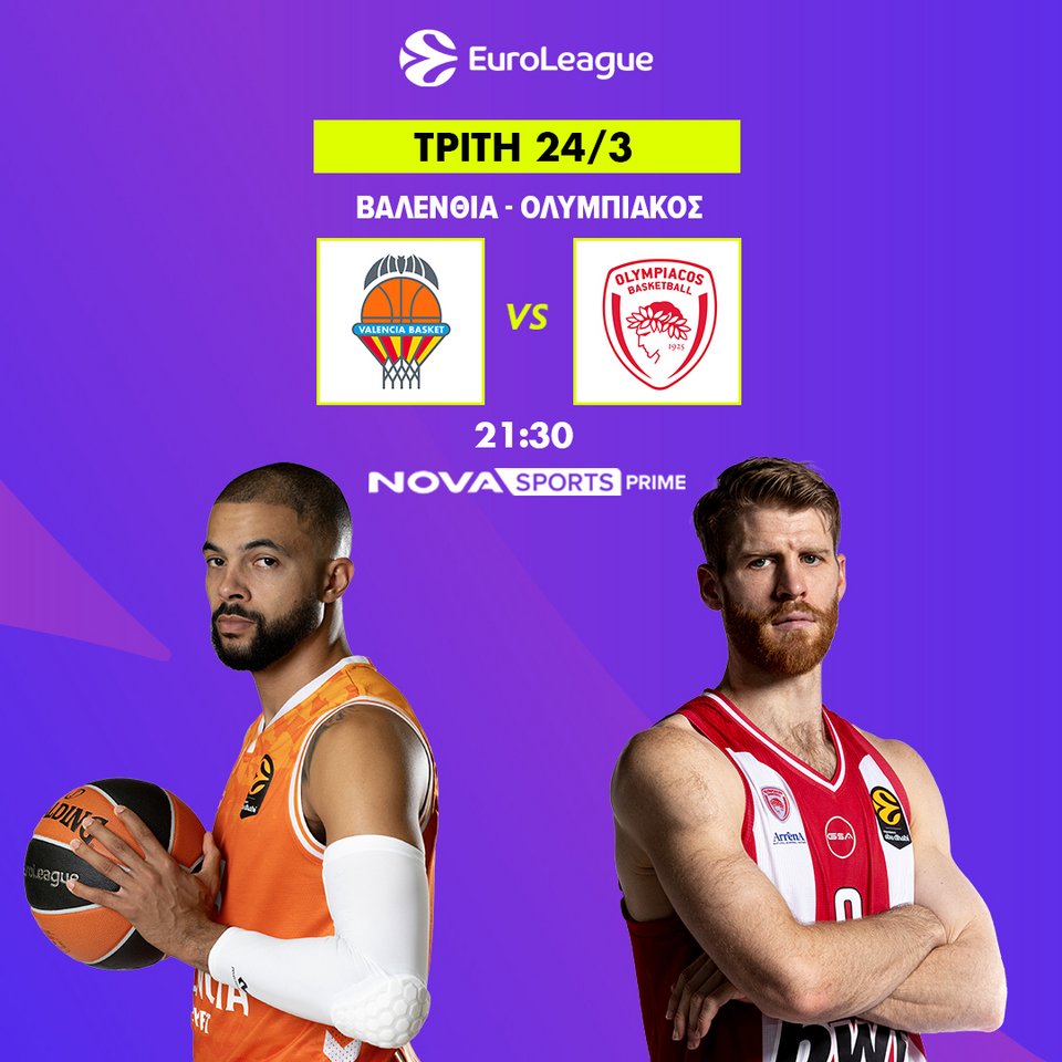 21:30 EuroLeague: Βαλένθια-Ολυμπιακός Novasports Prime σε περιγραφή του Χρήστου Καούρη