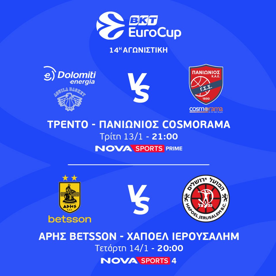 Το EuroCup συνεχίζεταιμε την 14η αγωνιστική οι συνδρομητές θα απολαύσουν τις αναμετρήσεις των δύο ελληνικών ομάδων, Τρέντο-Πανιώνιος Cosmorama Travel (13/1, 21:00) και Άρης Betsson-Χάποελ Ιερουσαλήμ (14/1, 20:00).