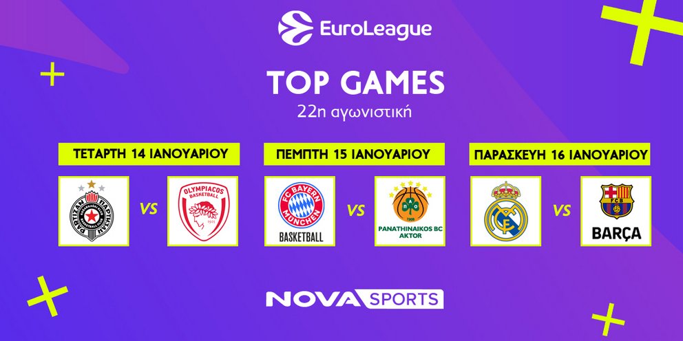 Στην κορυφαία ευρωπαϊκή διασυλλογική διοργάνωση, στην EuroLeague και για την 22η αγωνιστική, ο Ολυμπιακός δοκιμάζεται στην «Stark Arena» του Βελιγραδίου απέναντι στην Παρτίζαν (14/1, 20:30), ενώ ο Παναθηναϊκός AKTOR κοντράρεται στο Μόναχο με την Μπάγερν (15/1, 20:30). Παράλληλα, στο πρόγραμμα δεσπόζει και το ισπανικό «El Clasico», Ρεάλ Μαδρίτης – Μπαρτσελόνα (16/1, 21:45).
