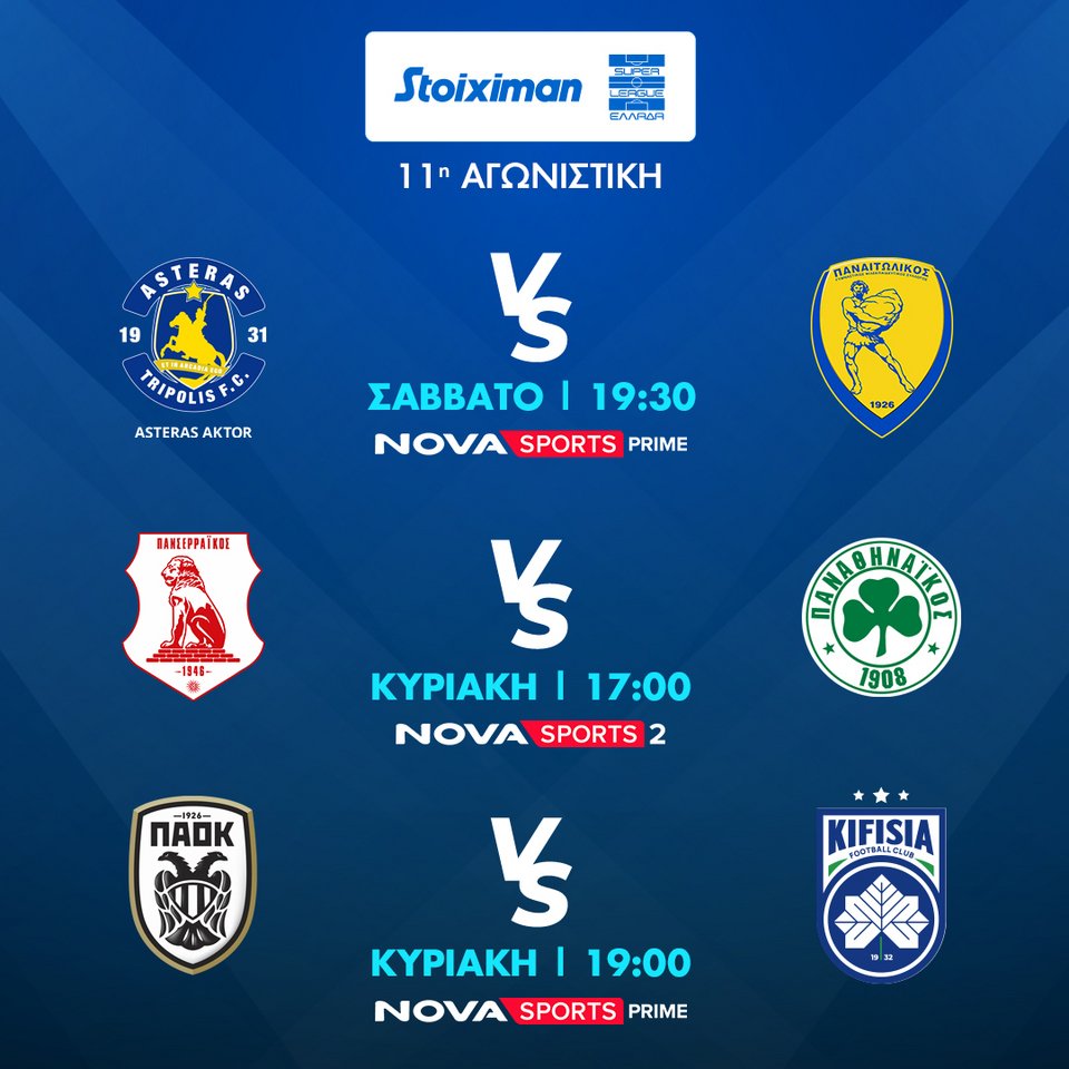 Η StoiximanSuperLeague, επιστρέφει στην αγωνιστική δράση με την 11η αγωνιστική και τις αναμετρήσεις Asteras Aktor – Παναιτωλικός (22/11, 19:30), Πανσερραϊκός – Παναθηναϊκός (23/11, 17:00), ΠΑΟΚ – Κηφισιά (23/11, 19:00) που θα μεταδοθούν στα κανάλια Novasports. Στα κανάλια CosmoteSportθα μεταδοθεί το ντέρμπι ΑΕΚ - Άρης (23/11, 21:00) καθώς και τα παιχνίδια Ολυμπιακός – Ατρόμητος (22/11, 20:00), Βόλος ΝΠΣ – Λεβαδειακός (24/11, 18:00) και ΑΕΛ Novibet – ΟΦΗ (24/11, 20:00). Οι αγώνες του ελληνικού πρωταθλήματος θα πλαισιωθούν στο Novasports με την αγαπημένη εκπομπή των φιλάθλων «Η Ώρα των Πρωταθλητών» με τους Γιαννίκο Δούσκα, Λίλα Κουντουριώτη, Αποστόλη Λάμπο, καθώς και με την εκπομπή «Monday Football Club» με τους Γιάννη Πάγκο και Ντέμη Νικολαΐδη.