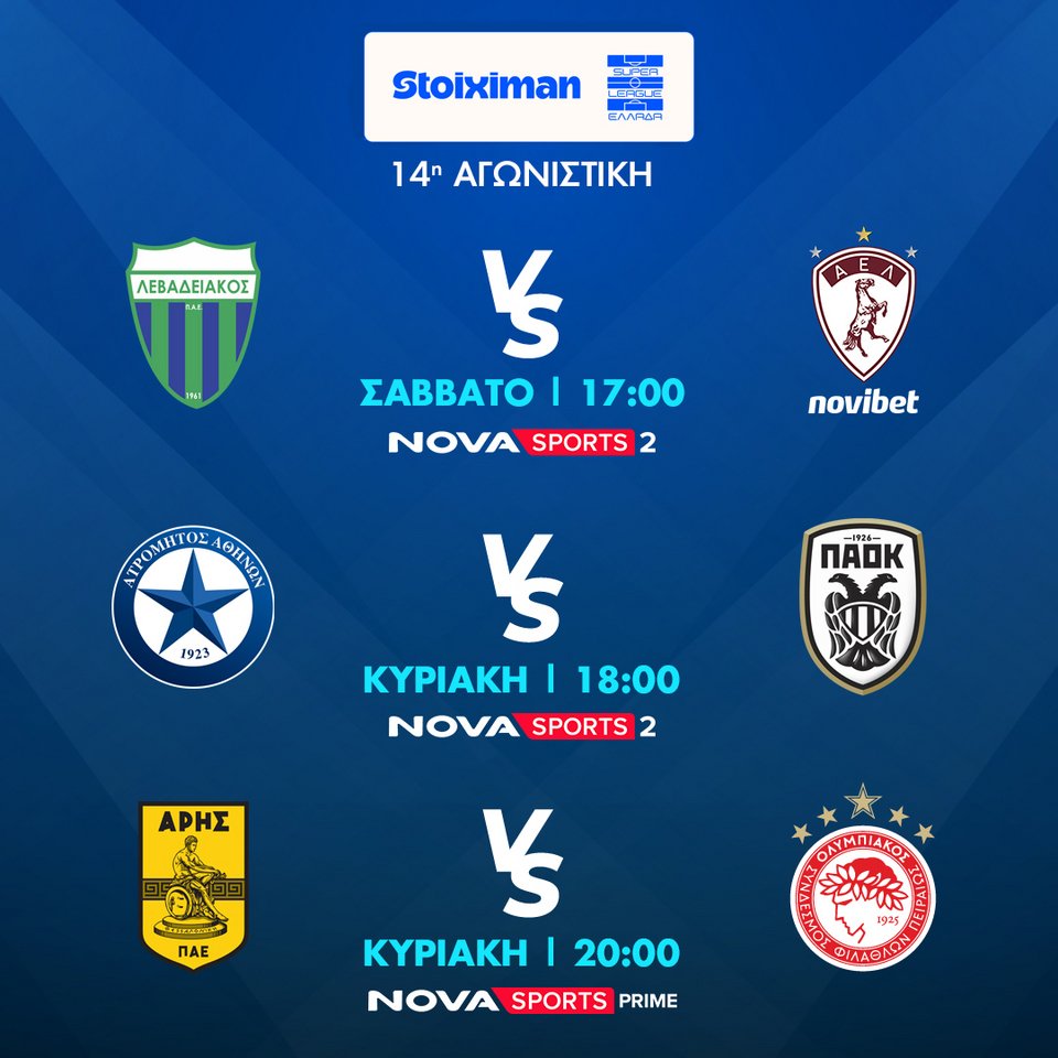 Η Stoiximan Super League, συνεχίζεται με την 14η αγωνιστική και από το πρόγραμμα δεσπόζει το ντέρμπι του «Κλεάνθης Βικελίδης», Άρης – Ολυμπιακός (14/12, 20:00) που θα μεταδοθεί στα κανάλια Novasports όπως και οι αγώνες Λεβαδειακός – ΑΕΛ Novibet (13/12, 17:00) και Ατρόμητος – ΠΑΟΚ (14/12, 18:00). Στα κανάλια Cosmote Sport θα μεταδοθούν οι αναμετρήσεις ΟΦΗ – Πανσερραϊκός (13/12, 18:00), Κηφισιά – Asteras Aktor (13/12, 20:00), Παναιτωλικός – ΑΕΚ (14/12, 17:30), Παναθηναϊκός – Βόλος ΝΠΣ (14/12, 21:00). Οι αγώνες του ελληνικού πρωταθλήματος θα πλαισιωθούν στο Novasports με την αγαπημένη εκπομπή των φιλάθλων «Η Ώρα των Πρωταθλητών» με τους Γιαννίκο Δούσκα, Λίλα Κουντουριώτη, Αποστόλη Λάμπο, καθώς και με την εκπομπή «Monday Football Club» με τους Γιάννη Πάγκο και Ντέμη Νικολαΐδη.