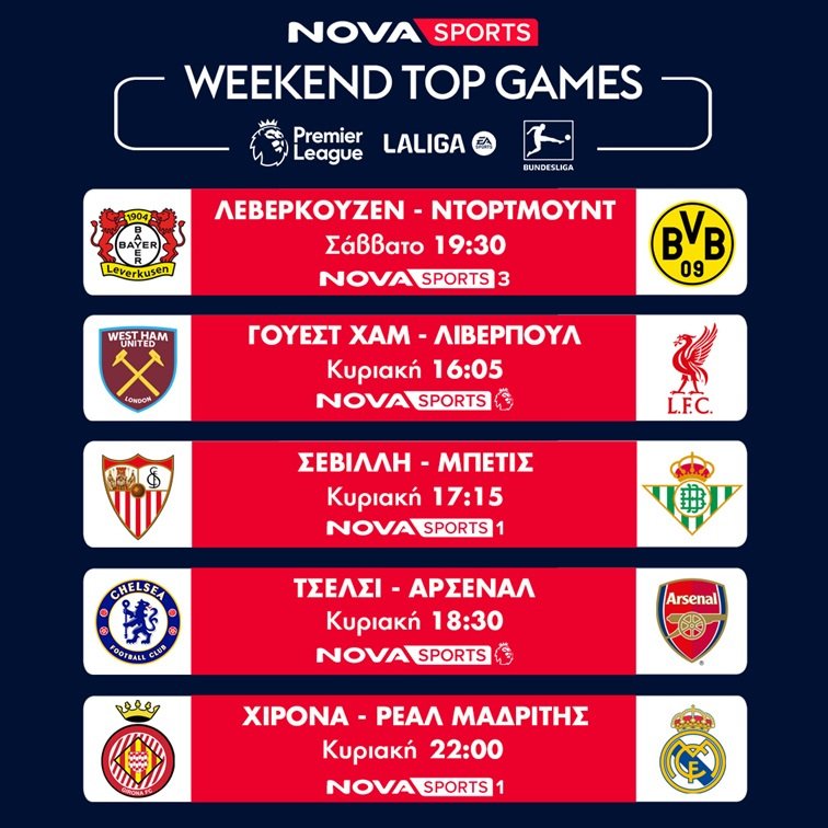H Premier League, το κορυφαίο πρωτάθλημα στον κόσμο και με τη φωνή του Χρήστου Σωτηρακόπουλου στα κανάλια Novasports, συνεχίζεται με την 13η αγωνιστική όπου τα βλέμματα στρέφονται στο λονδρέζικο ντέρμπι Tσέλσι – Άρσεναλ (30/11, 18:30) καθώς και στις αναμετρήσεις Μάντσεστερ Σίτι – Λιντς (29/11, 17:00), Τότεναμ – Φούλαμ (29/11, 22:00), Κρίσταλ Πάλας – Μάντσεστερ Γιουνάιτεντ (30/11, 14:00), Νότιγχαμ Φόρεστ – Μπράιτον (30/11, 16:05), Γουέστ Χαμ – Λίβερπουλ (30/11, 16:05). Η Premier League θα πλαισιωθεί με τις εκπομπές «Premier League Kick Off» και «Premier League The Show» με τον Άγγελο Στυλιάδη και τον Γιώργο Σαμαρά.