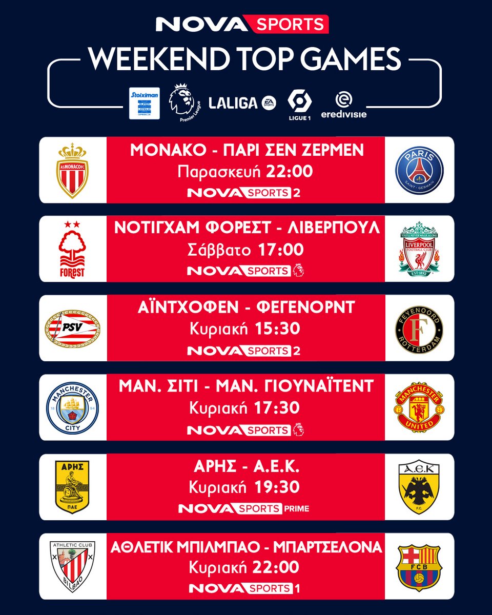 Με διπλή αγωνιστική και την αυλαία της κανονικής σεζόν στην Stoiximan Super League με Πανσερραϊκός – ΠΑΟΚ και Άρης – ΑΕΚ, με την Premier League και το ντέρμπι του Μάντσεστερ, Σίτι – Γιουνάιτεντ, με την LaLiga EA Sports και Ρεάλ Μαδρίτης – Σεβίλλη, Αθλέτικ Μπιλμπάο – Μπαρτσελόνα, με τηn Βundesliga και Φράιμπουργκ – Μπάγερν, με τη Ligue 1 και Μονακό – Παρί Σεν Ζερμέν και Eredivisie με Αϊντχόφεν – Φέγενορντ!