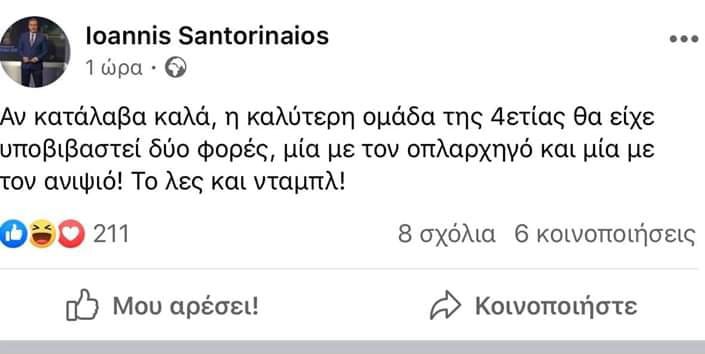 Συγκεκριμένα ανέφερε: "Αν κατάλαβα καλά, η καλύτερη ομάδα της τετραετίας θα είχε υποβιβαστεί δύο φορές, μία με τον οπλαρχηγό και μία με τον ανιψιό! Το λες και νταμπλ".