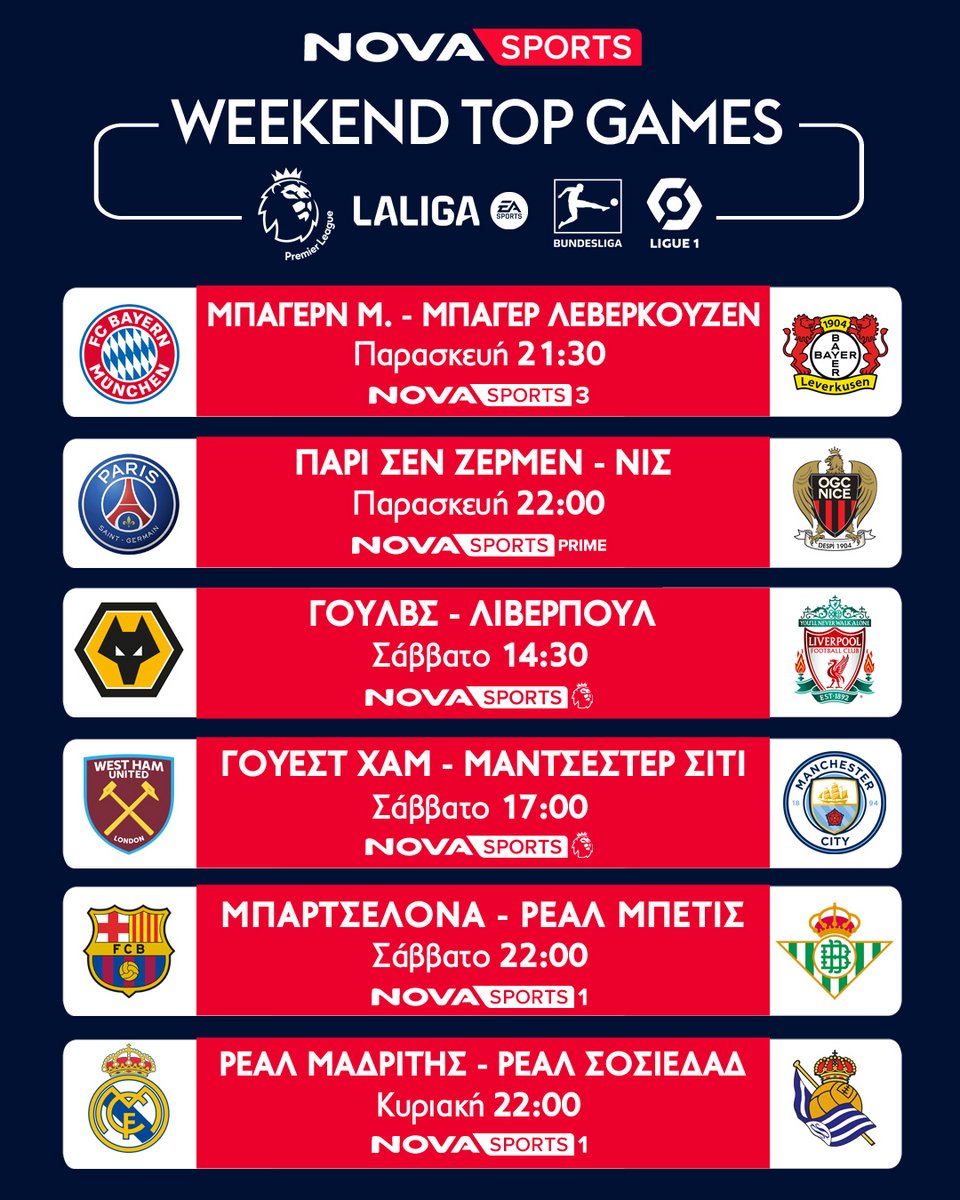 Φυσικά, όλη η PremierLeague, το κορυφαίο πρωτάθλημα στον κόσμο παίζει αποκλειστικά στο Novasports με όλους τους αγώνες LIVE, ενώ από το πρόγραμμα ξεχωρίζει το ντέρμπι Μπάγερν – Λεβερκούζεν στη Bundesliga, οι αγώνες Ρεάλ Μαδρίτης-Ρεάλ Σοσιεδάδ, Μπαρτσελόνα – Μπέτις στη LaLigaEASports, η αναμέτρηση Παρί Σεν Ζερμέν-Νις στη Ligue 1 ενώ συναρπαστική δράση έχουμε και στα πρωταθλήματα της ολλανδικής Eredivisie, της βελγικήςJupilerProLeague, της γερμανικής2.Bundesliga, της ισπανικής LaLigaHypermotionκαθώς καιτης ιταλικήςκαι της βραζιλιάνικηςSerieB.