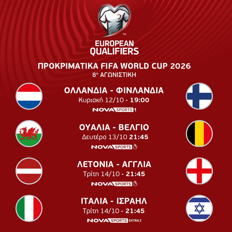 Στα κανάλια Novasports δεσπόζει η δράση στα UEFA European Qualifiers για το Μουντιάλ του 2026 και οι συνδρομητές θα έχουν την ευκαιρία να απολαύσουν όλους τους αγώνες για την 7η και 8η αγωνιστική, όπου δεσπόζουν οι αναμετρήσεις Τσεχία – Κροατία (9/10, 21:45), Πορτογαλία – Ιρλανδία (11/10, 21:45), Σερβία – Αλβανία (11/10, 21:45), Ισπανία – Γεωργία (11/10, 21:45), Ολλανδία – Φινλανδία (12/10, 19:00), Ισλανδία – Γαλλία (13/10, 21:45), Β. Ιρλανδία – Γερμανία (13/10, 21:45), Ουαλία – Βέλγιο (13/10, 21:45), Ισπανία – Βουλγαρία (14/10, 21:45), Λετονία – Αγγλία (14/10, 21:45), Ιταλία – Ισραήλ (14/10, 21:45), Πορτογαλία – Ουγγαρία (14/10, 21:45) οι οποίες θα μεταδοθούν LIVE.