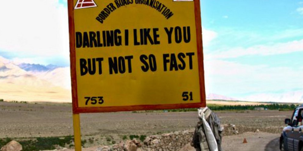 «Αγάπη μου μην μου γκρινιάζεις συνεχώς όταν οδηγώ». Σίγουρα σκέψη που έχει περάσει από το μυαλό πολλών ανδρών όταν η συνοδηγός μουρμουράει ασταμάτητα. Αλλά και πινακίδα; Στα βουνά της Ινδίας υπάρχει ακόμη και αυτή. Η οδική σήμανση στην περιοχή έχει ποιηματάκια, ακατανόητες συμβουλές και μερικές φορές υπονοούμενα.