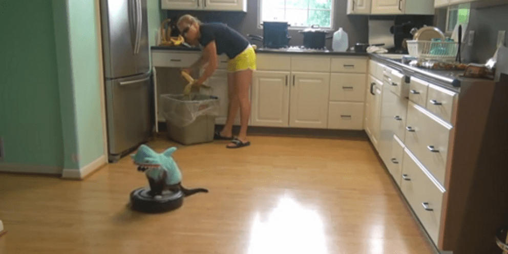 Το εν λόγω κατοικίδιο δείχνει να απολαμβάνει ιδιαίτερα τη βόλτα του πάνω στο μηχάνημα καθαρισμού του πατώματος, ενώ εντυπωσιακές είναι οι ενδυματολογικές προτιμήσεις, καθώς φοράει μια στολή καρχαρία.