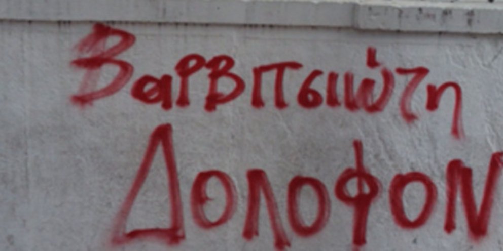 Ετσι, κόλλησαν στην πόρτα το ψήφισμα και έγραψαν συνθήματα κατά του υπουργού στο κτίριο. «Βαρβιτσιώτη είσαι δολοφόνος», «Το Φαρμακονήσι ήταν δολοφονία», «Κανένας άνθρωπος στη θάλασσα» και άλλα παρόμοια.
