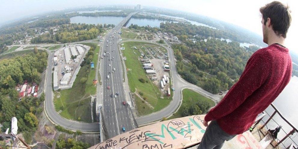 σκαρφαλώνουν στην ύψους περίπου 115 μέτρων γέφυρα της Ουκρανίας Moscow Bridge στο Κίεβο και επιχειρούν μέχρι και ανάποδα άλματα, χωρίς την χρήση σχετικής ασφάλειας.