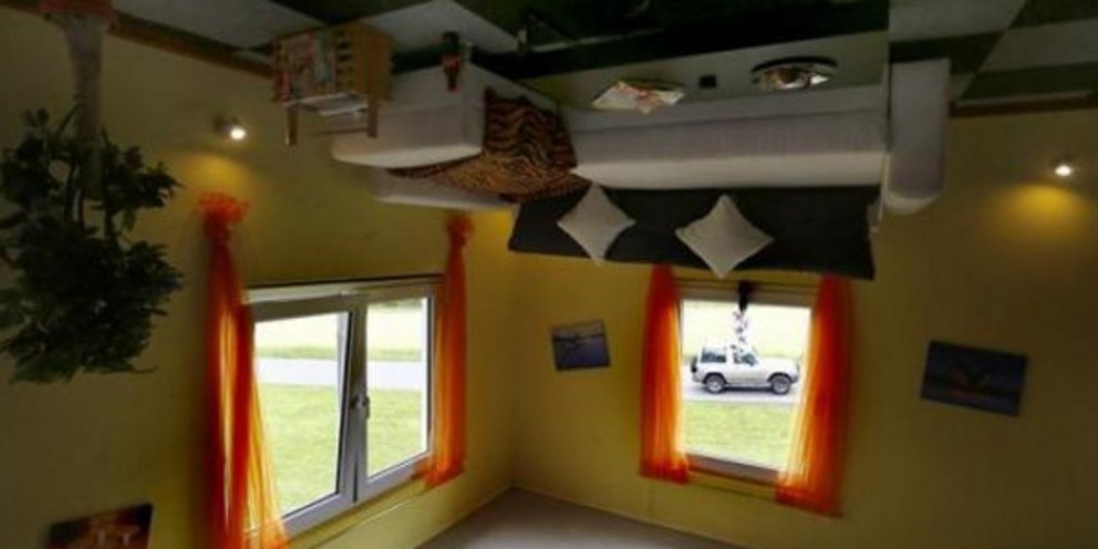 Βέβαια, δεν πρόκειται για κατοικία, αλλά για μία τουριστική ατραξιόν στο χωριό Αφολντερν, στη Γερμανία. Οι τρεις φίλοι που είχαν τη συγκεκριμένη έμπνευση χρειάστηκαν έξι εβδομάδες και 200.000 ευρώ. Το αποτέλεσμα σίγουρα μαγνητίζει το βλέμμα μια και οι επισκέπτες παθαίνουν... βέρτιγκο μπαίνοντας στο «Τρελό σπίτι», αφού έπιπλα και λοιπά αντικείμενα που συνήθως είναι στο πάτωμα, κοσμούν το ταβάνι του, μια και όλα είναι ανάποδα.
