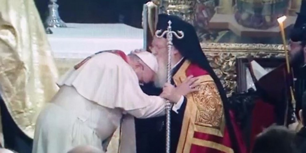 Mετά το πέρας των προσφωνήσεων ο πάπας Φραγκίσκος κατευθύνθηκε προς τον Οικουμενικό Πατριάρχη, όπου σκύβει το κεφάλι του μπροστά στον Προκαθήμενο της Ορθοδοξίας και εκείνος τον φίλα στο κεφάλι.