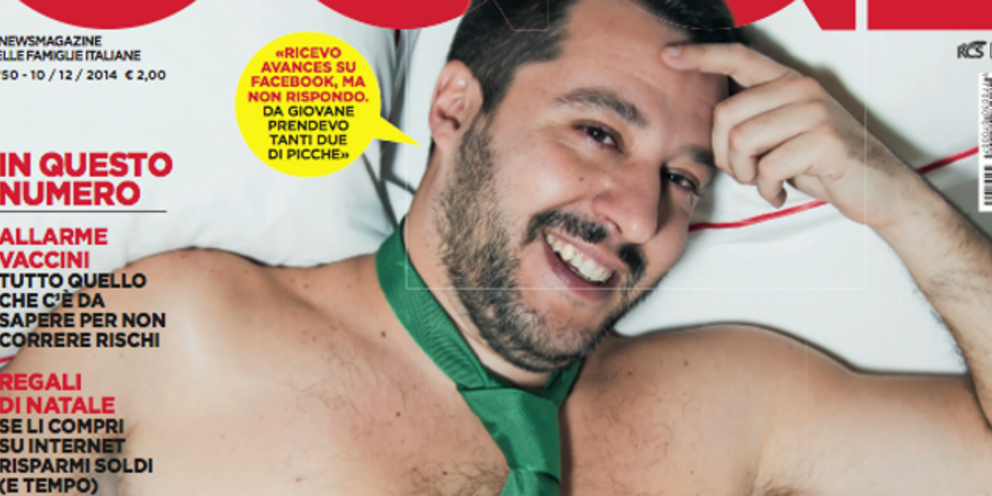 Χωρίς μπλούζα, με μία γραβάτα, αποκαλύπτοντας το δασύτριχο στήθος του και ξαπλωμένος σε κρεβάτι, ο Σαλβίνι ζήτησε με αυτή την αμφίεση από τον κόσμο να τον ψηφίσει, μιλώντας στο περιοδικό Oggi. Με αυτό τον τρόπο ο ηγέτης του ξενοφοβικού κόμματος της Ιταλίας, που τάσσεται κατά του ευρώ, θέλησε να δείξει μία πιο χαλαρή πλευρά ενός πολιτικού που έχει επιλέξει ένα ξεκάθαρα σκληρό πρόσωπο στην πολιτική σκηνή.