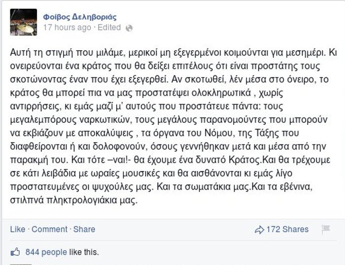 Σε μια ανάρτηση που δεν κατονομάζει, ωστόσο φωτογραφίζει τον απεργό πείνας Νίκο Ρωμανό, προχώρησε την Τρίτη ο τραγουδοποιός Φοίβος Δεληβοριάς στην προσωπική του σελίδα στο Facebook.
