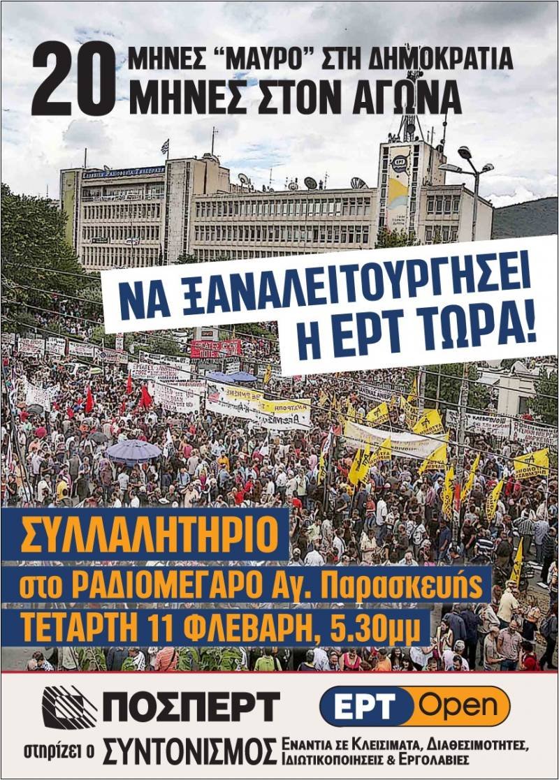 «Συλλαλητήριο έξω από το Ραδιομέγαρο της ΕΡΤ στην Αγ. Παρασκευή οργανώνουν την Τετάρτη 11 Φλεβάρη στις 5.30μμ η ΠΟΣΠΕΡΤ και ο Συντονισμός ενάντια σε κλεισίματα και διαθεσιμότητες. Για να απαιτήσουμε όλοι μαζί να ξανανοίξει η ΕΡΤ τώρα, σαν ένα πρώτο βήμα στον αγώνα να ξηλωθούν όλες οι μνημονιακές επιθέσεις, για να γυρίσουν όλοι οι απολυμένοι στις δουλειές τους. Οι εκλογές τελείωσαν και η μισητή συγκυβέρνηση Σαμαρά και Βενιζέλου, καταβαραθρώθηκε με παταγώδη τρόπο. Η κατάρρευσή τους και η εκλογική εκτίναξη της αριστεράς μαςαφήνουν όλα τα περιθώρια για να επιβάλλουμε ότι όλα όσα παλεύαμε τα τελευταία πέντε χρόνια θα γίνουν πράξη και θα δικαιωθούν οι αγώνες μας.