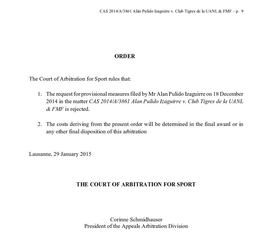 Σσύμφωνα με απόφαση απορρίφθηκε ο ισχυρισμός του ποδοσφαιριστή ότι είναι ελεύθερος και έτσι είναι αναγκασμένος να επιστρέψει άμεσα στο Μεξικό. Κάτι που σημαίνει ότι δεν μπορεί να πάρει τώρα μεταγραφή ούτε στον Λεβαδειακό όπως ήθελε ο Γιάννης Κομπότης, ούτε στον Ολυμπιακό όπως ήθελαν οι Πειραιώτες εδώ και μήνες.