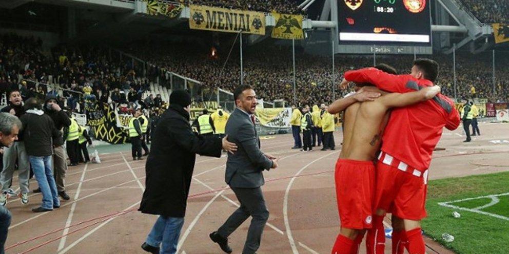 Δευτερόλεπτα πριν, ο Χάρα έχει σκοράρει για τον Ολυμπιακό και δίνει προβάδισμα πρόκρισης στην ομάδα ελάχιστα λεπτά πριν την ολοκλήρωση του ντέρμπι με την ΑΕΚ. Παίκτες και τεχνική ηγεσία των ερυθρόλευκων πανηγυρίζουν με με μερίδα οπαδών της Ένωσης να μπαίνουν με απειλητικές διαθέσεις στον αγωνιστικό χώρο και ενώ ο Βίτορ Περέιρα με χειρονομίες πανηγυρίζει προκλητικά μπροστά τους.