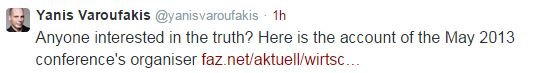 "Ενδιαφέρεται κανείς για την αλήθεια;" έγραψε ο Γιάνης Βαρουφάκης παραθέτοντας στη συνέχεια ένα άρθρο της γερμανικής FAZ που φιλοξενεί συνέντευξη του διοργανωτή του συνεδρίου, από το οποίο προέρχεται το βίντεο, Srecko Horvat.