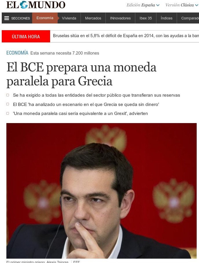 Η ΕΚΤ «ανέλυσε το σενάριο που θέλει την Ελλάδα να μένει χωρίς λεφτά και να ξεκινήσει να πληρώνει τους δημοσίους υπαλλήλους με κουπόνια (τα λεγόμενα IOU), δημιουργώντας έτσι ένα δεύτερο εικονικό νόμισμα μέσα στο μπλοκ του ευρώ» αναφέρουν στην El Mundo αξιωματούχοι της Φρανκφούρτης που όμως δεν κατονομάζονται. «Η ιδέα των IOU δεν είναι καινούρια» διευκρινίζει η Σάντσες και αναφέρει πως έχει χρησιμοποιηθεί σε διάφορες ενώσεις και πως «τις τελευταίες εβδομάδες και η κυβέρνηση Τσίπρα δεν τα βλέπει με κακό μάτι». Ομως, «μια τέτοια επιλογή δεν θα απέτρεπε μια μεγαλύτερη κρίση, συμπεριλαμβανομένης και της εξόδου της Ελλάδας από την Ενωση» διευκρινίζει η Ισπανίδα δημοσιογράφος. Ενα παράλληλο νόμισμα θα ισοδυναμούσε σχεδόν με ένα Grexit» σημειώνουν αξιωματούχοι της ΕΚΤ στην «El Mundo».