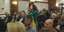 Οσοι βρισκόντουσαν στην αίθουσα έδειξαν κατάπληκτοι από το συμβάν, ενώ η γυναίκα έδειχνε ότι μπήκε στην εκδήλωση για να την πάρουν οι κάμερες.