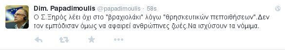 Σήμερα το πρωί ο Δημήτρης Παπαδημούλης έγραψε στο Τwitter εμφανώς οργισμένος: «Ο Σ. Ξηρός λέει όχι στο "βραχιολάκι" λόγω "θρησκευτικών πεποιθήσεων". Δεν τον εμπόδισαν όμως να αφαιρεί ανθρώπινες ζωές. Να ισχύσουν τα νόμιμα».
