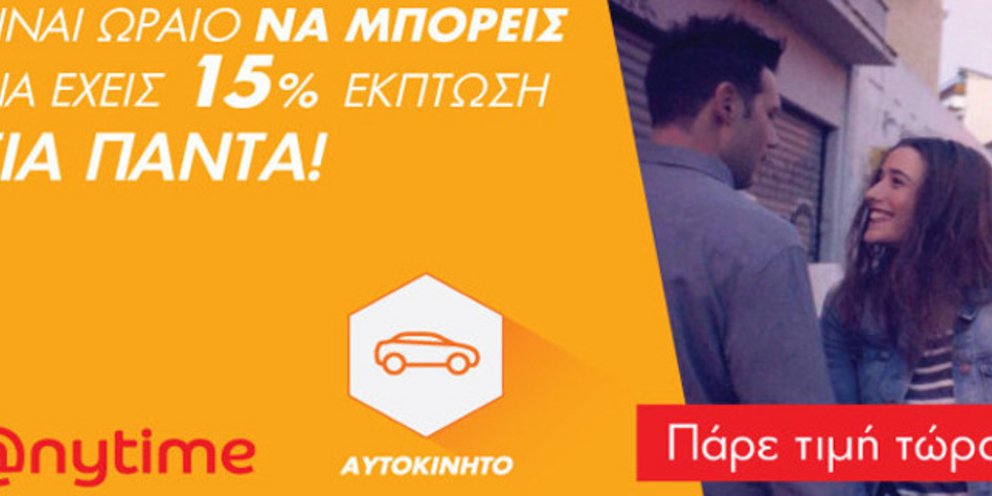 Τώρα, στην Anytime πληρώνεις λιγότερα και παίρνεις πραγματικά περισσότερα, γιατί με κάθε νέα ασφάλεια αυτοκινήτου εξασφαλίζεις web offer έκπτωση 15%.