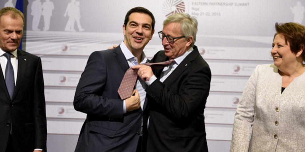 Πήρε τη γραβάτα του και την έβαλε μπροστά από το πουκάμισο του Ελληνα πρωθυπουργού. Ο Αλέξης Τσίπρας υποδέχθηκε με χαμόγελο την κίνηση αυτή, ενώ αμέσως ξεκίνησαν οι ψίθυροι για την αποκωδικοποίηση της κίνησης Γιούνκερ.