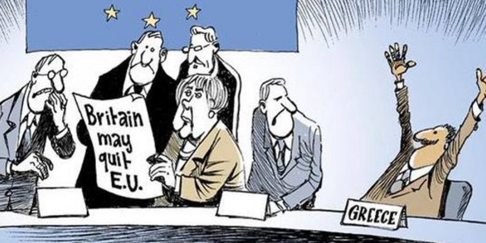 Την κατάσταση αυτής της κρίσης απεικονίζει με μοναδικό τρόπο ένα σκίτσο, που δημοσίευσε ο χρήστης The Greek Analyst στο Twitter. Σε αυτό, η Καγκελάριος και οι λοιποί Ευρωπαίοι προβληματίζονται πάνω από ένα χαρτί που γράφει «Η Βρετανία μπορεί να εγκαταλείψει την ΕΕ», την ώρα που δίπλα τους ένας Ελληνας φωνάζει σηκώνοντας πανηγυρικά τα χέρια «Αλλά εγώ μένω!».
