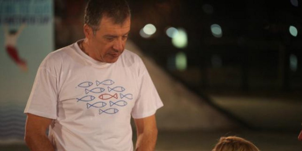 The designs include a red fish swimming against the flow, a backpack clip-art (Theodorakis appeared on TV walking with a backpack to interview subjects) and Heraclitus' famous quote Panta Rhei (πάντα ρει) "everything flows".